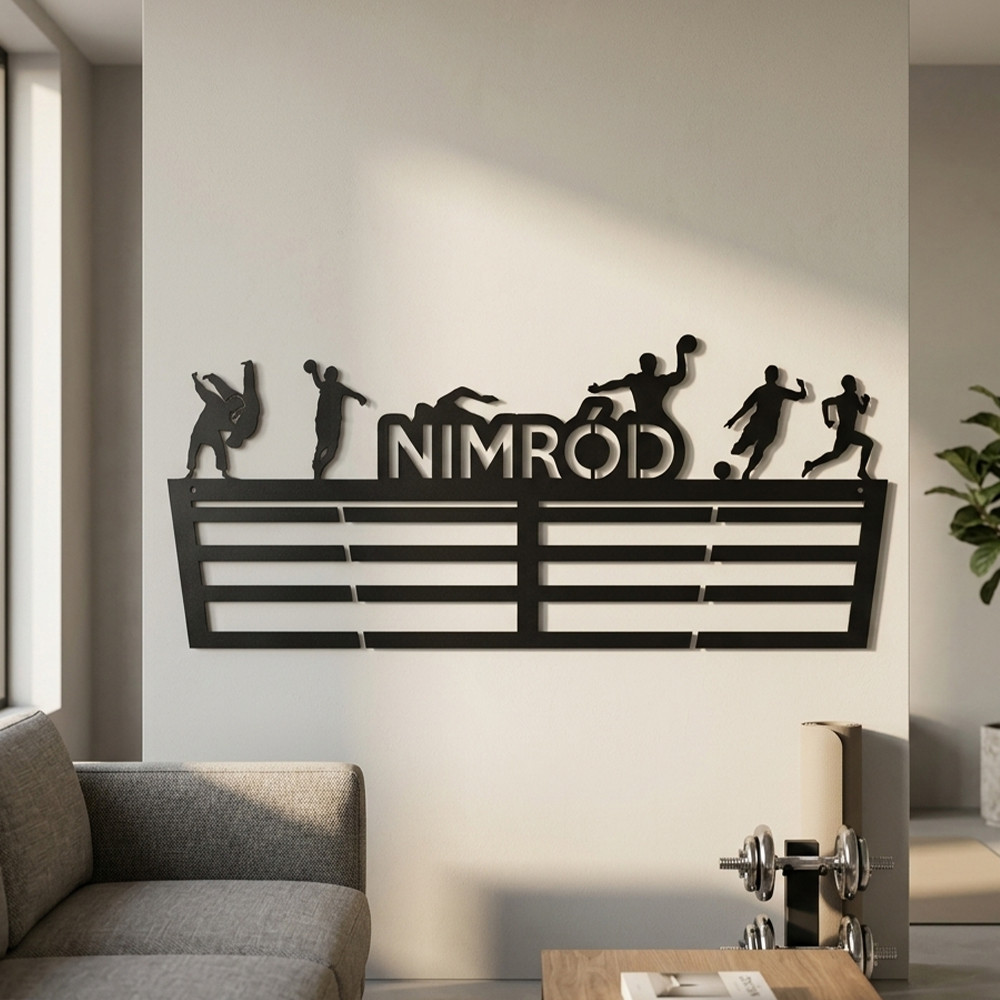 Egy 2 mm acélból lézerrel vágott, fekete matt felületű éremtartót, amelyen a te neved és hat általad választott sport ikonja szerepel. Nem kell hozzá semmit csinálnod: a szükséges rögzítőkkel együtt érkezik. Falra kerül, és ott is marad.