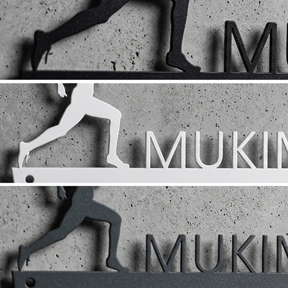 A 2 mm-es acél nem fog meghajlani a futóérmek súlya alatt. A prémium matt porszórt, szinterezett bevonat karcálló és fénytartó – az edzőteremben, a folyosón, a nappaliban egyaránt tartja a formáját. A neve nem egy felragasztott betűkészlet: a lézer közvetlenül a fémbe dolgoz, nem fakulhat el, nem pereghet le.