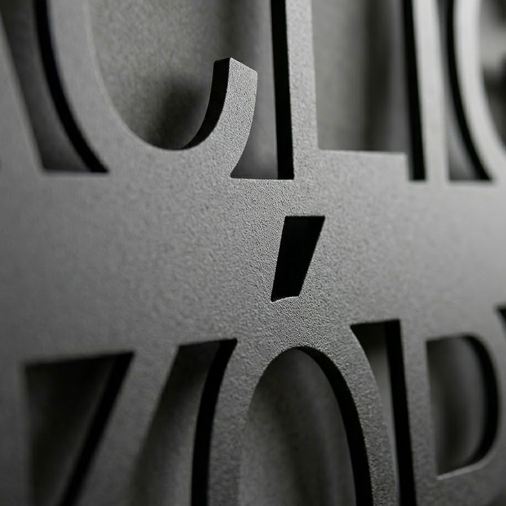 A tábla lézervágott alumíniumból készül, prémium matt porszórt, szinterezett bevonattal – ellenáll a karcoknak, nem fakul, hosszú élettartam. Nem matrica, nem fólia, nem nyomtatott felirat: a betűk és a szám közvetlenül a fémlapba vannak vágva.