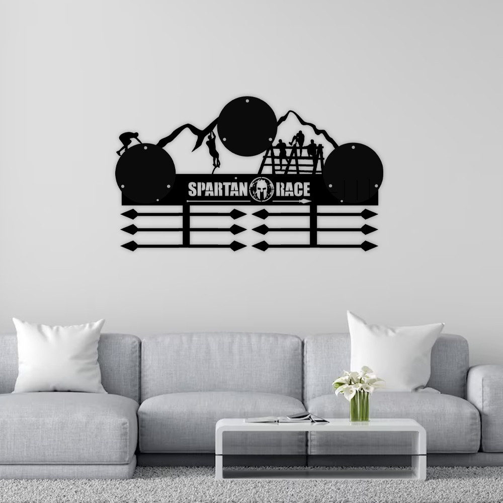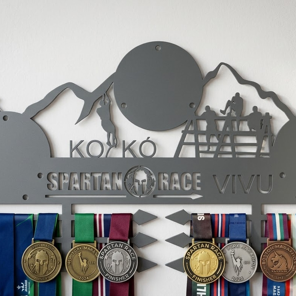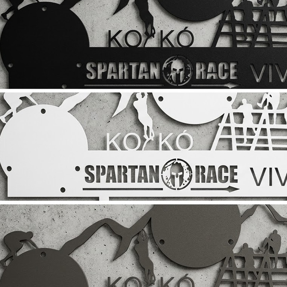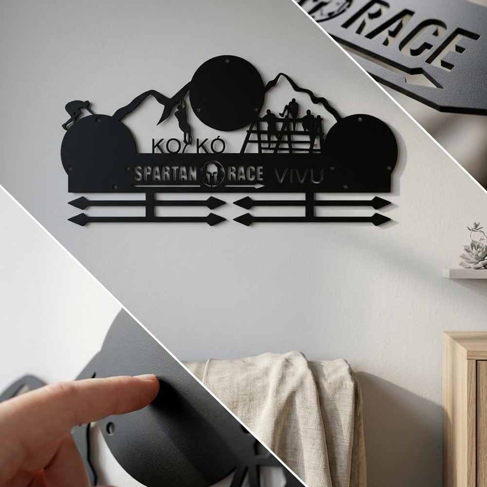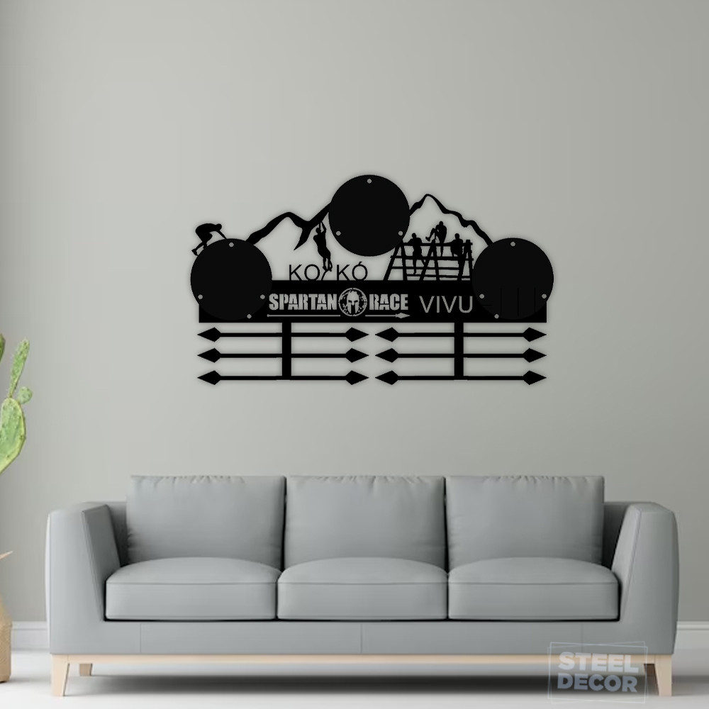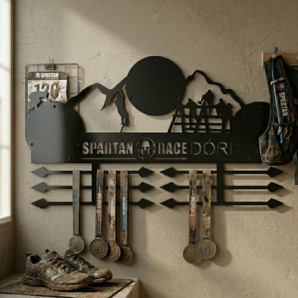 Spartan éremtartó névvel és 3 Trifectával – acél fali dekoráció