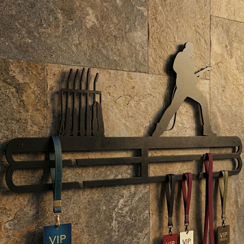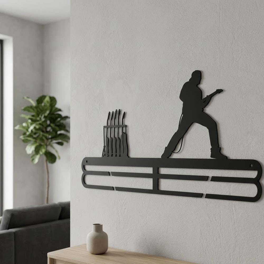 Gitáros badge akasztó – acél fali tartó nyakpántokhoz
