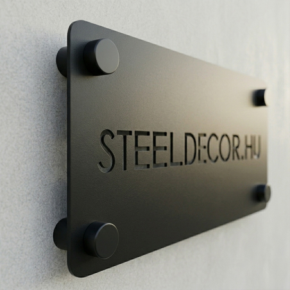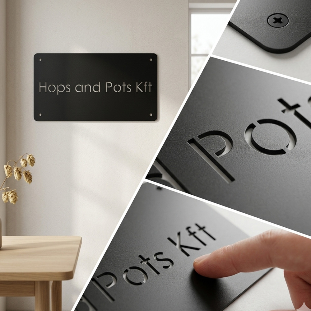 A lézervágás nem hagy éles sorját, a vágott élek simák és egyenletesek. A felirat maga nem matricázott, nem ragasztott réteg – a szöveg ki van vágva a féltáblából, tehát nem tud lekopni, nem tud leválni. Ez a megoldás évekkel hosszabb élettartamot jelent, mint bármelyik ragasztott vagy fóliázott változat.